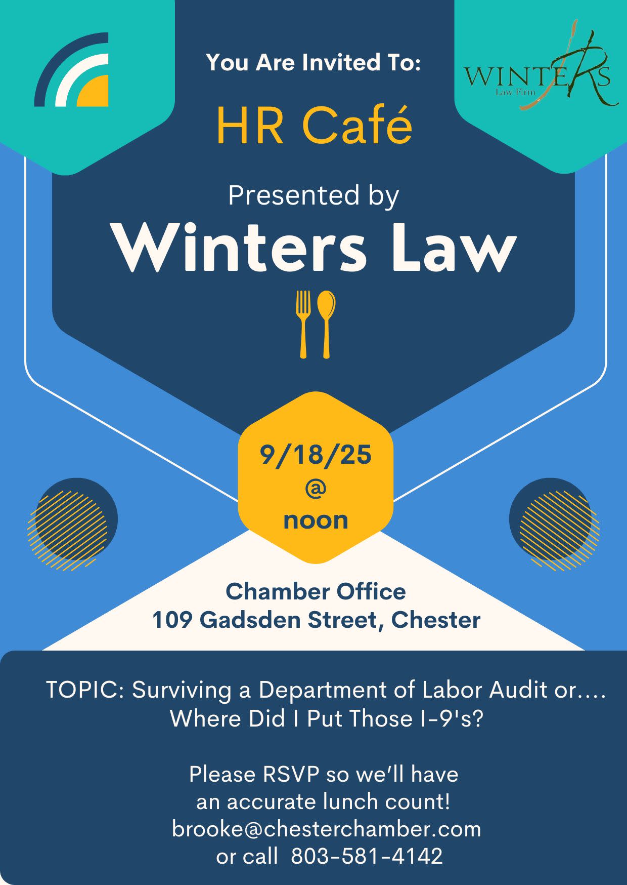 HR Cafe with Winters Law Firm is September 18th. The topic is a timely one--Surviving a Department of Labor Audit or....Where Did I Put Those I-9's?